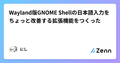 - 12/22Wayland版GNOME Shellの日本語入力をちょっと改善する拡張機能をつくったWayland版GNOME Shellの日本語入力をちょっと改善する拡張機能をつくった