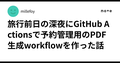- 12/3旅行前日の深夜にGitHub Actionsで予約管理用のPDF生成workflowを作った話旅行前日の深夜にGitHub Actionsで予約管理用のPDF生成workflowを作った話|millefoy