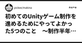 - 12/16初めてのUnityゲーム制作を進めるためにやってよかった5つのこと ~制作半年でイベント出展するまで~初めてのUnityゲーム制作を進めるためにやってよかった5つのこと ~制作半年でイベント出展するまで~|pickee/makina